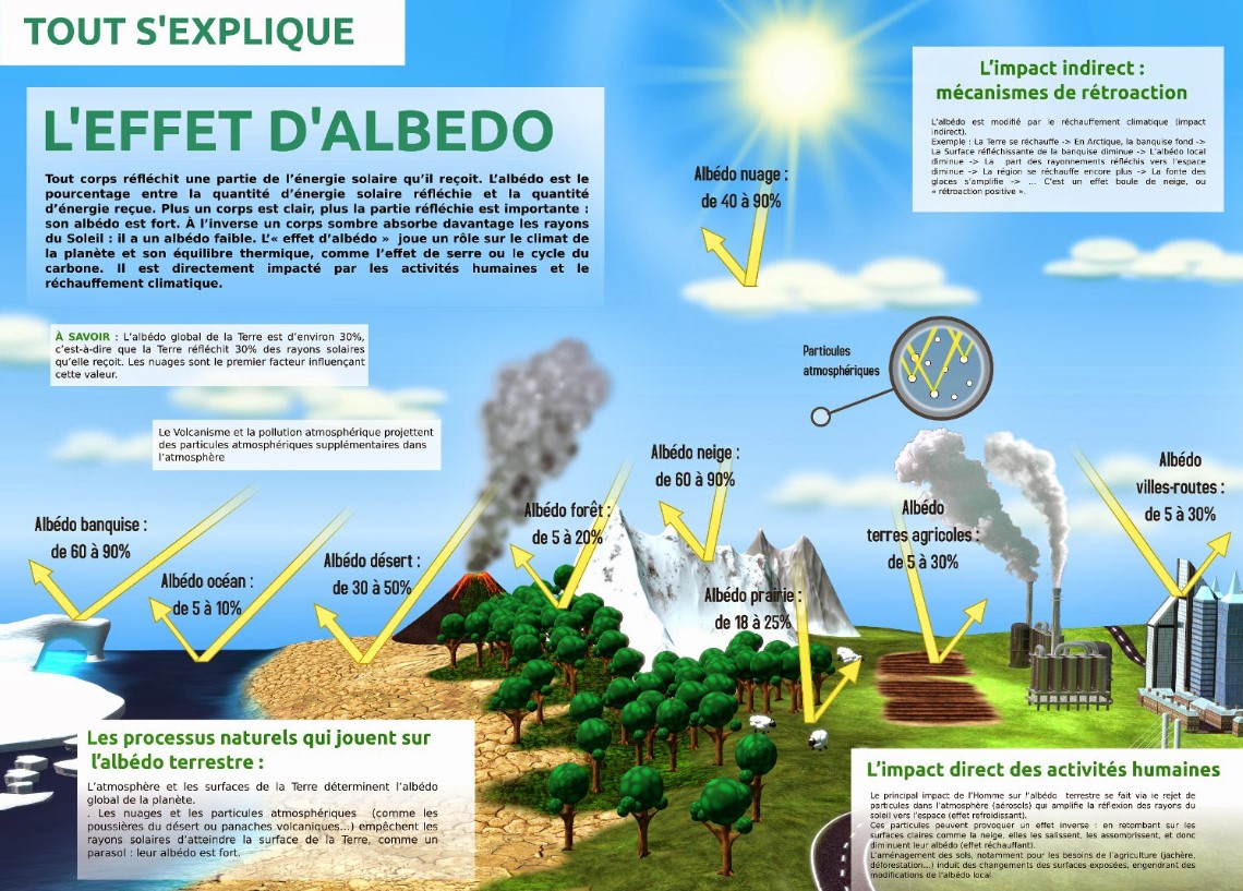 On appelle albédo la proportion d’énergie réfléchie par rapport à l’énergie reçue : ainsi, plus l’albédo est fort, plus il y a d’énergie réfléchie et donc moins il y a d’énergie absorbée (donc moins il fait chaud)