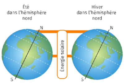 L’inclinaison de l’axe de rotation de la Terre par rapport au plan de l’écliptique et la forme ronde de la Terre font varier l’angle d’incidence (donc la surface de réception) des rayons solaires à un moment donnée en fonction de l’endroit sur la planète. Cela explique les variations de la température et de l’ensoleillement en fonction de la latitude.